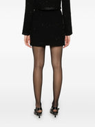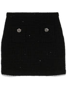 This black skirt features a stretchy, textured design with sequin and rhinestone details.