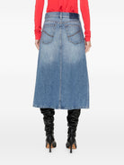 This stylish denim midi skirt offers a flattering A-line shape and timeless appeal.