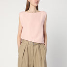 This sleeveless blouse is made from a light pink viscose and linen blend, perfect for warm weather.
