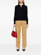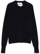 This navy cashmere cardigan features fine ribbing and decorative stitching for elevated style.