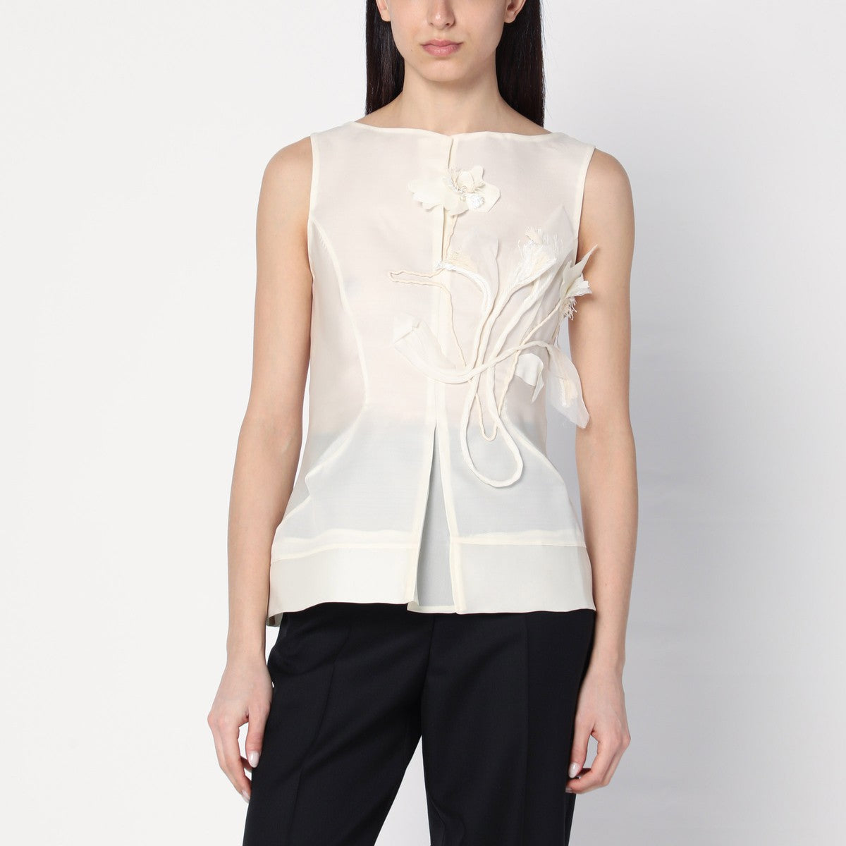 Elegant sleeveless top with subtle floral embroidery for a sophisticated look.