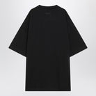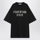Fear Of God Essentials black cotton jersey T-shirt, featuring short sleeves, ribbed crew neck, dropped shoulders, rubber logo patch on the back, contrasting front logo lettering print and oversized fit.