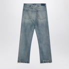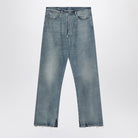 These faded blue jeans offer a stylish, worn-in look with unique buckle detail.