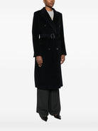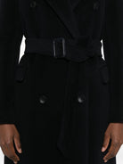 This stylish coat features a belted waist and peak lapels for a sophisticated look.